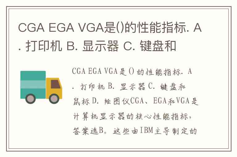 CGA EGA VGA是()的性能指标. A. 打印机 B. 显示器 C. 键盘和鼠标 D. 绘图仪