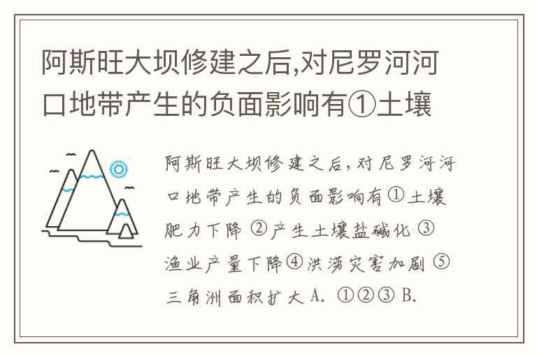 阿斯旺大坝修建之后,对尼罗河河口地带产生的负面影响有①土壤肥力下降 ②产生土壤盐碱化 ③渔业产量下降④洪涝灾害加剧 ⑤三角洲面积扩大 A. ①②③ B. ②③④ C. ①③⑤ D. ①②④