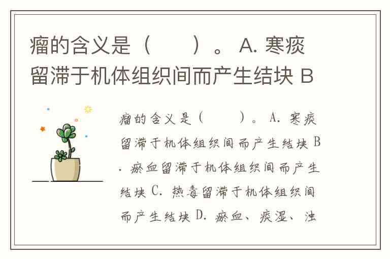 瘤的含义是( )。 A. 寒痰留滞于机体组织间而产生结块 B. 瘀血留滞于机体组织间而产生结块 C. 热毒留滞于机体组织间而产生结块 D. 瘀血、痰湿、浊气停留于人体组织之中而产生的结块 E. 浊气停留于机体组织间而产生结块