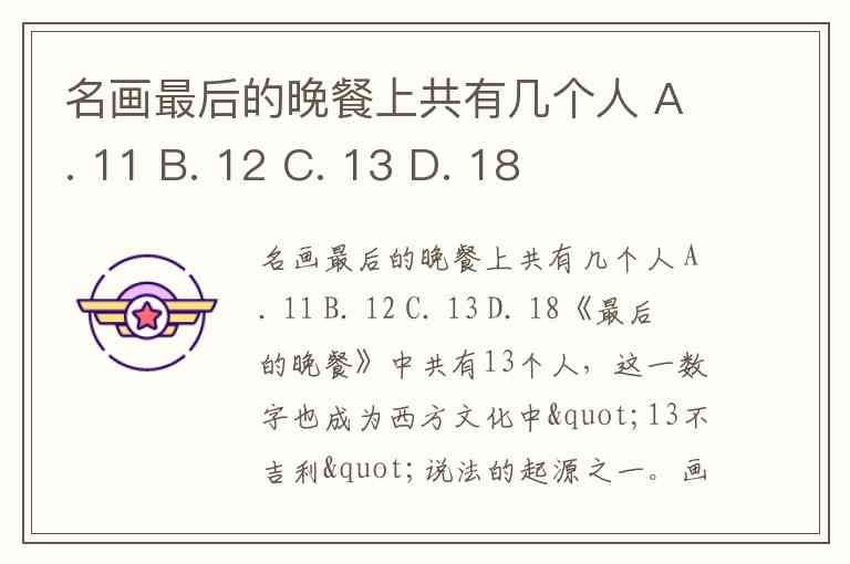 名画最后的晚餐上共有几个人 A. 11 B. 12 C. 13 D. 18
