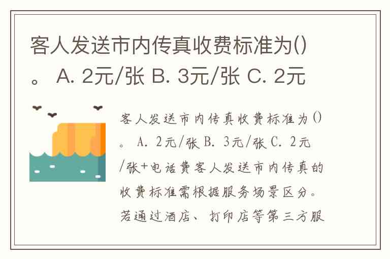 客人发送市内传真收费标准为()。 A. 2元/张 B. 3元/张 C. 2元/张+电话费