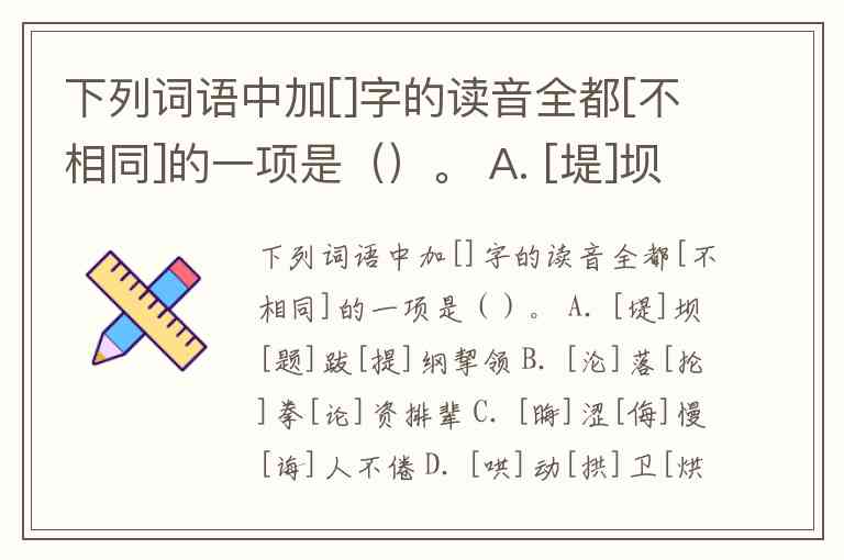 下列词语中加[]字的读音全都[不相同]的一项是()。 A. [堤]坝[题]跋[提]纲挈领 B. [沦]落[抡]拳[论]资排辈 C. [晦]涩[侮]慢[诲]人不倦 D. [哄]动[拱]卫[烘]云托月