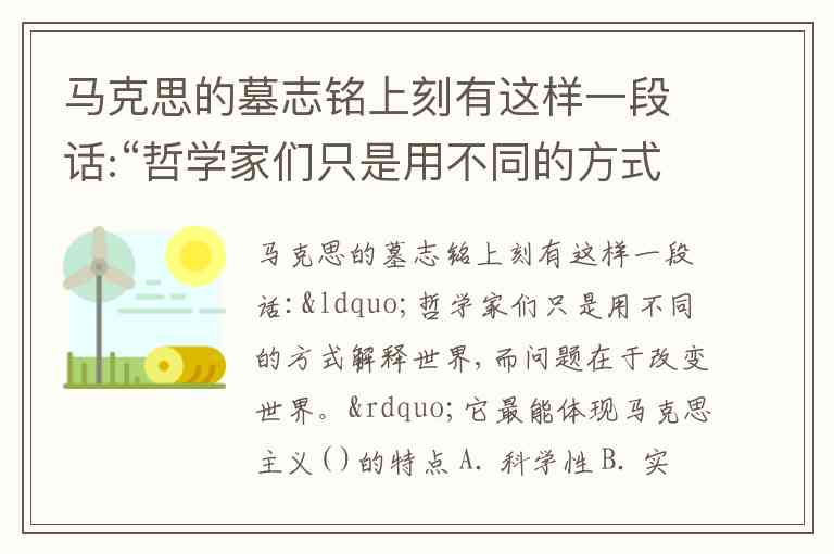 马克思的墓志铭上刻有这样一段话:“哲学家们只是用不同的方式解释世界,而问题在于改变世界。”它最能体现马克思主义( )的特点 A. 科学性 B. 实践性 C. 人民性 D. 革命性