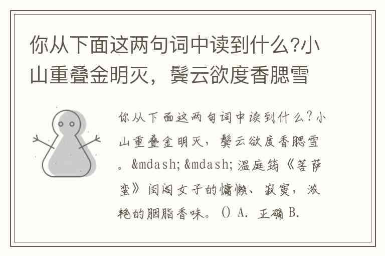 你从下面这两句词中读到什么?小山重叠金明灭,鬓云欲度香腮雪。——温庭筠《菩萨蛮》闺阁女子的慵懒、寂寞,浓艳的胭脂香味。() A. 正确 B. 错误