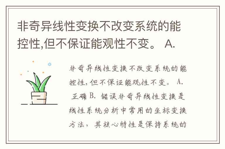 非奇异线性变换不改变系统的能控性,但不保证能观性不变。 A. 正确 B. 错误