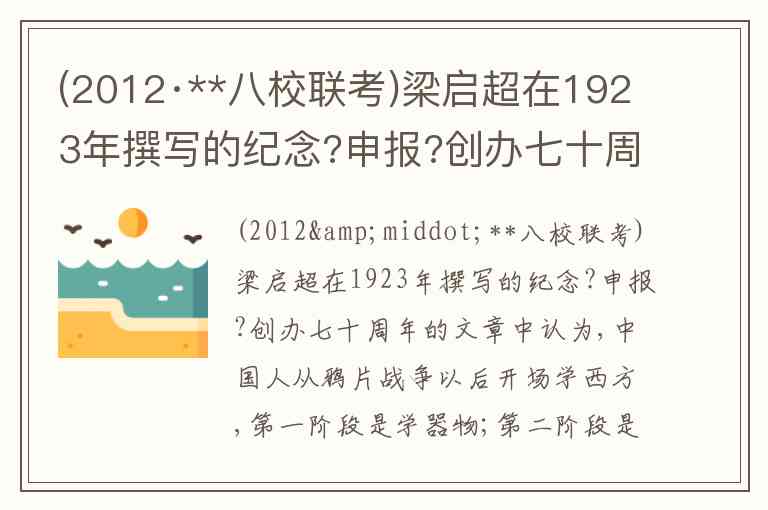 (2012·**八校联考)梁启超在1923年撰写的纪念?申报?创办七十周年的文章中认为,中国人从鸦片战争以后开场学西方,第一阶段是学器物;第二阶段是学制度;第三阶段是学精神文化。以下各项中,属于第二阶段的代表性主*是( )。 A. “师夷长技以制夷〞 B. “中学为体,西学为用〞 C. “今日策中国者,必曰兴〞 D. “三纲五常〞乃“之道德〞