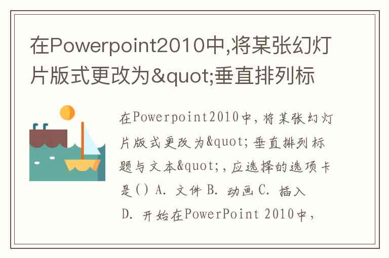 在Powerpoint2010中,将某张幻灯片版式更改为"垂直排列标题与文本",应选择的选项卡是( ) A. 文件 B. 动画 C. 插入 D. 开始