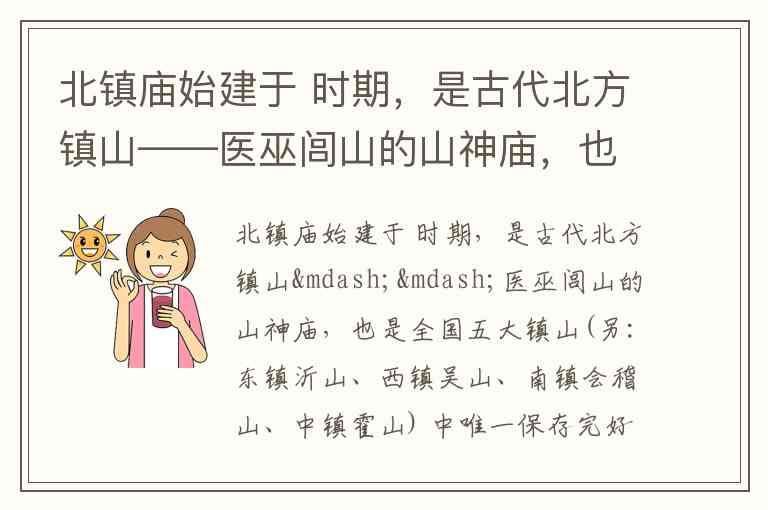 从隋文帝确立祭祀制度到明清历代帝王的持续尊崇,北镇庙见证了中央政权对北方边疆的文化整合。如今,这座1988年被列为全国重点文物保护单位的古建筑群,仍以其完整的格局和丰富的遗存,诉说着"五镇"与"五岳"并行的古代山岳祭祀传统。