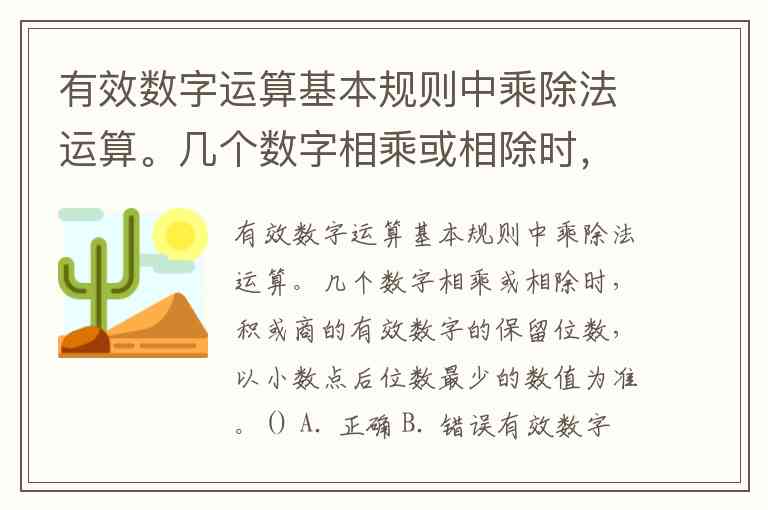 有效数字运算基本规则中乘除法运算。几个数字相乘或相除时,积或商的有效数字的保留位数,以小数点后位数最少的数值为准。() A. 正确 B. 错误