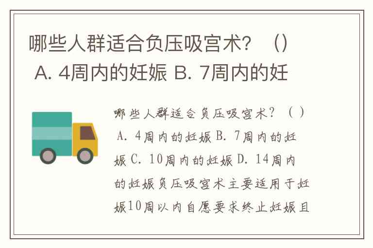 哪些人群适合负压吸宫术?() A. 4周内的妊娠 B. 7周内的妊娠 C. 10周内的妊娠 D. 14周内的妊娠
