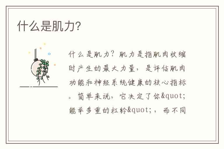 肌力是指肌肉收缩时产生的最大力量,是评估肌肉功能和神经系统健康的核心指标。简单来说,它决定了你"能举多重的杠铃",而不同于肌肉爆发力("举得多快")或耐力("举多久")。这种力量不仅是日常活动的基础,更是医学判断神经损伤、康复进展的关键依据。