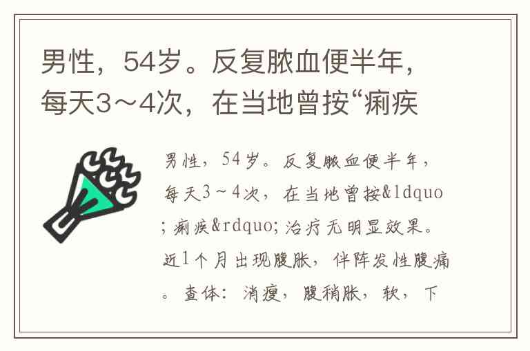 男性,54岁。反复脓血便半年,每天3~4次,在当地曾按“痢疾”治疗无明显效果。近1个月出现腹胀,伴阵发性腹痛。查体:消瘦,腹稍胀,软,下腹轻压痛,右下腹可扪及一肿块,质较硬,尚可活动。首选的辅助检查 A. 纤维结肠镜检查 B. B超 C. 钡餐检查 D. 大便细菌培养 E. CT