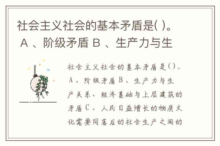 社会主义社会的基本矛盾是( )。 A 、阶级矛盾 B 、生产力与生产关系、经济基础与上层建筑的矛盾 C 、人民日益增长的物质文化需要同落后的社会生产之间的矛盾 D 、人民内部矛盾 A. 阶级矛盾 B. 生产力与生产关系、经济基础与上层建筑的矛盾 C. 人民日益增长的物质文化需要同落后的社会生产之间的矛盾 D. 人民内部矛盾