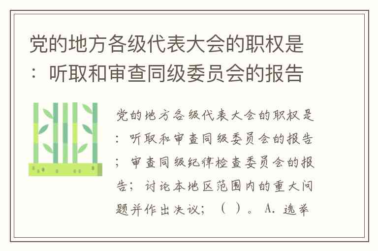 党的地方各级代表大会的职权是:听取和审查同级委员会的报告;审查同级纪律检查委员会的报告;讨论本地区范围内的重大问题并作出决议;( )。 A. 选举同级党的委员会 B. 选举同级党的委员会,选举同级党的纪律检查委员会 C. 选举上级党的委员会,选举同级党的纪律检查委员会 D. 选举上级党的纪律检查委员会