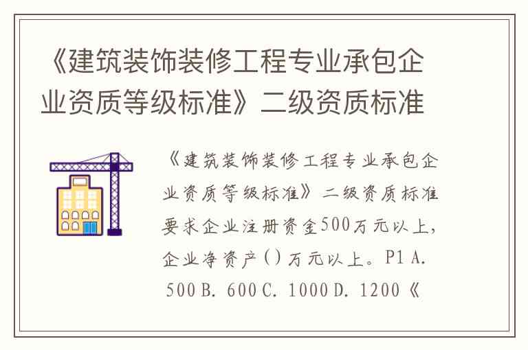 《建筑装饰装修工程专业承包企业资质等级标准》二级资质标准要求企业注册资金500万元以上,企业净资产( )万元以上。P1 A. 500 B. 600 C. 1000 D. 1200