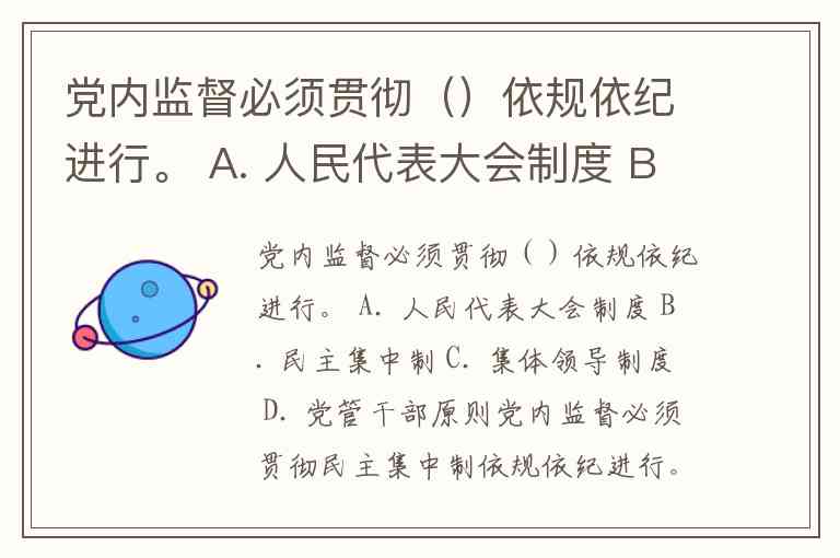 党内监督必须贯彻()依规依纪进行。 A. 人民代表大会制度 B. 民主集中制 C. 集体领导制度 D. 党管干部原则