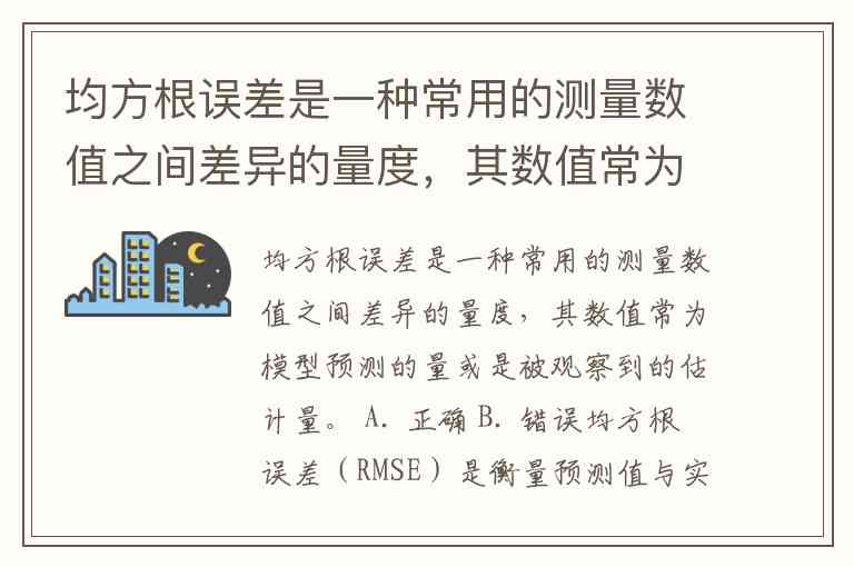 均方根误差(RMSE)是衡量预测值与实际值之间差异的常用指标,核心作用是评估模型预测精度,而非单纯描述数据自身特性。题目中“被观察到的估计量”这一表述不准确,因为RMSE的本质是通过计算预测误差(预测值与真实值的差异)的平方均值再开方,重点关注模型预测偏差,而非数据本身的估计特性。