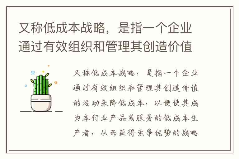 又称低成本战略,是指一个企业通过有效组织和管理其创造价值的活动来降低成本,以便使其成为本行业产品或服务的低成本生产者,从而获得竞争优势的战略。 A. 差异化战略 B. 成本差异化战略 C. 集中化战略 D. 成本领先战略