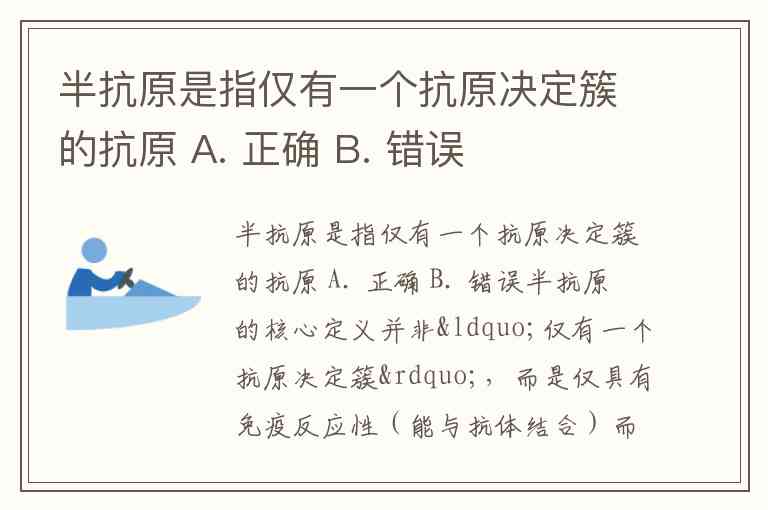 因此,题目混淆了半抗原的核心属性(免疫原性缺失)与结构特征(类似单一表位)。正确答案为B. 错误。理解这一概念需抓住本质:半抗原的“不完全”源于功能缺陷(无法独立激发免疫),而非结构上的决定簇数量限制。这种区别在医学实践中至关重要,例如疫苗设计常利用半抗原-载体偶联技术增强免疫原性。