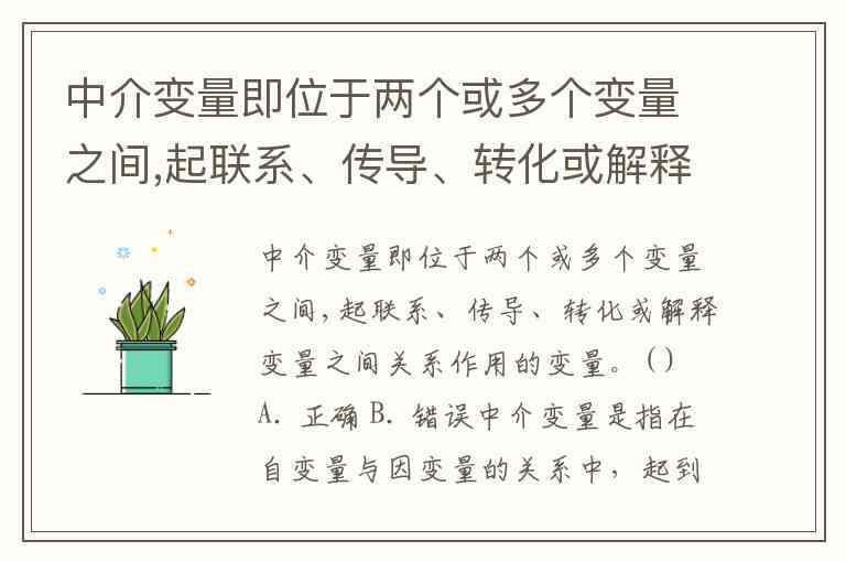 中介变量即位于两个或多个变量之间,起联系、传导、转化或解释变量之间关系作用的变量。( ) A. 正确 B. 错误