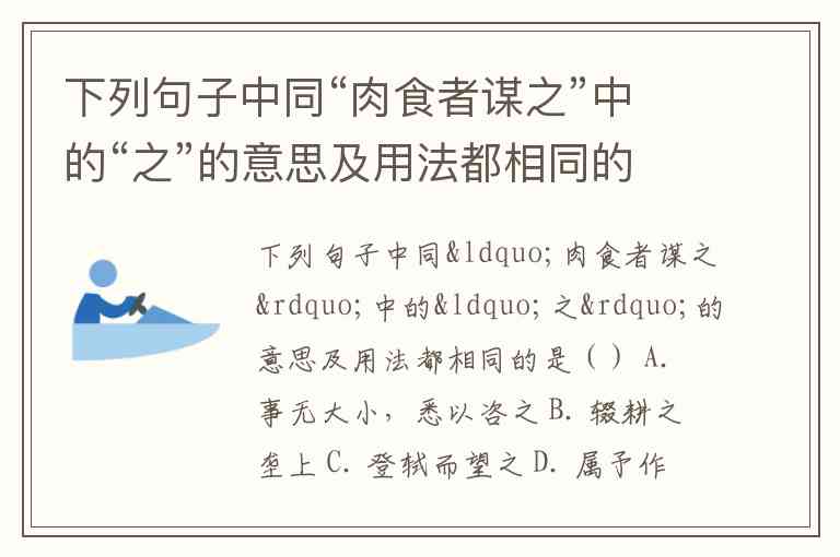 下列句子中同“肉食者谋之”中的“之”的意思及用法都相同的是() A. 事无大小,悉以咨之 B. 辍耕之垄上 C. 登轼而望之 D. 属予作文以记之