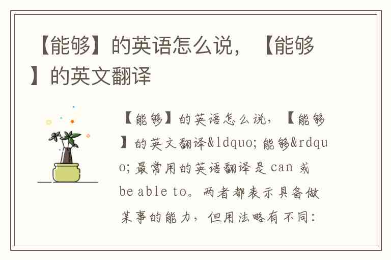 “能够”最常用的英语翻译是 can 或 be able to。两者都表示具备做某事的能力,但用法略有不同:can 更口语化,常用于日常表达;be able to 更正式,可用于更多时态。例如:“我能游泳”可译为 I can swim 或 I am able to swim。