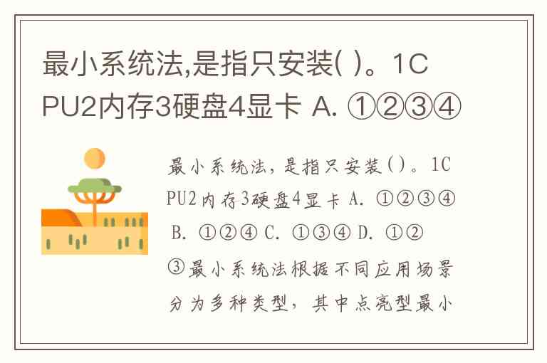 最小系统法根据不同应用场景分为多种类型,其中点亮型最小系统需安装CPU、内存和显卡(或依赖CPU核显),无需硬盘即可实现基础开机自检。这一结论可从多个权威解释中得到验证: