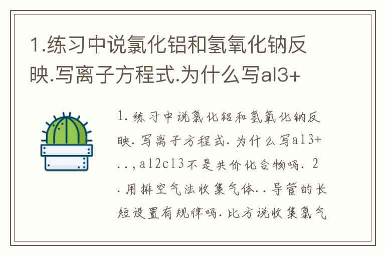 1.练习中说氯化铝和氢氧化钠反映.写离子方程式.为什么写al3+..,al2cl3不是共价化合物吗. 2.用排空气法收集气体..导管的长短设置有规律吗.比方说收集氯气.导管似乎是长进短出.那么是否可以这样说呢.密度比空气大的就是长进短出.密度比空气小的就是短进长出. 3.合金的优点是什么.什么削弱啊.比如硬度熔点怎么变化.化合物中含碳量增加,硬度减小吗? 4.HCL HBr HI 我酸性强弱.agcl agbr agi的溶解性强弱.HF是弱酸吗? 无论兄弟们是否会解答,我都发自内心的感谢.但是不会的不要乱写与大篇复制.