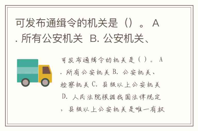 可发布通缉令的机关是()。 A. 所有公安机关 B. 公安机关、检察机关 C. 县级以上公安机关 D. 人民法院