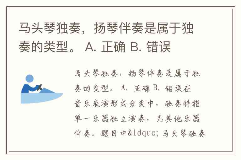 在音乐表演形式分类中,独奏特指单一乐器独立演奏,无其他乐器伴奏。题目中“马头琴独奏,扬琴伴奏”包含两种乐器——马头琴作为主要演奏乐器,扬琴提供伴奏,这种形式属于器乐合奏中的“主奏与伴奏”组合,而非严格意义上的独奏。