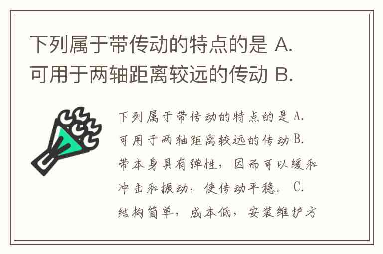 下列属于带传动的特点的是 A. 可用于两轴距离较远的传动 B. 带本身具有弹性,因而可以缓和冲击和振动,使传动平稳。 C. 结构简单,成本低,安装维护方便,带损坏后容易更换。 D. 由于需要施加张紧力,所以轴及轴承受到的不平衡径向力 较大。