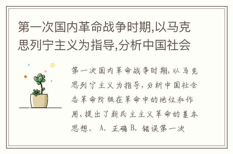第一次国内革命战争时期,以马克思列宁主义为指导,分析中国社会各革命阶级在革命中的地位和作用,提出了新民主主义革命的基本思想。 A. 正确 B. 错误