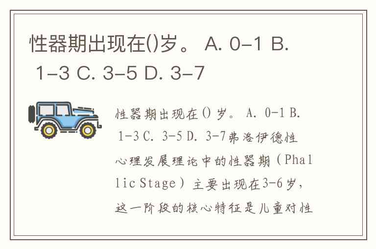 性器期出现在()岁。 A. 0-1 B. 1-3 C. 3-5 D. 3-7