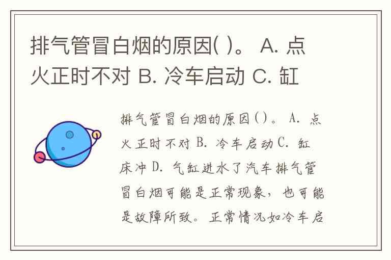 排气管冒白烟的原因( )。 A. 点火正时不对 B. 冷车启动 C. 缸床冲 D. 气缸进水了