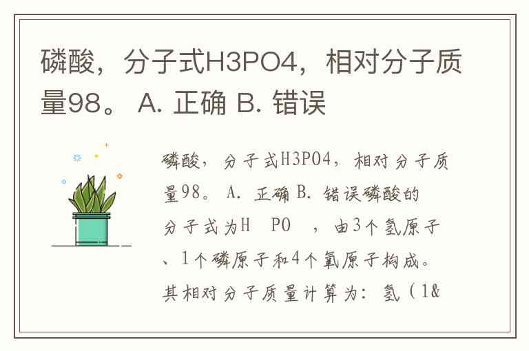 磷酸,分子式H3PO4,相对分子质量98。 A. 正确 B. 错误