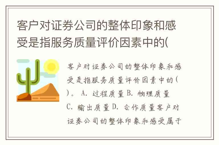 客户对证券公司的整体印象和感受是指服务质量评价因素中的( )。 A. 过程质量 B. 物理质量 C. 输出质量 D. 合作质量