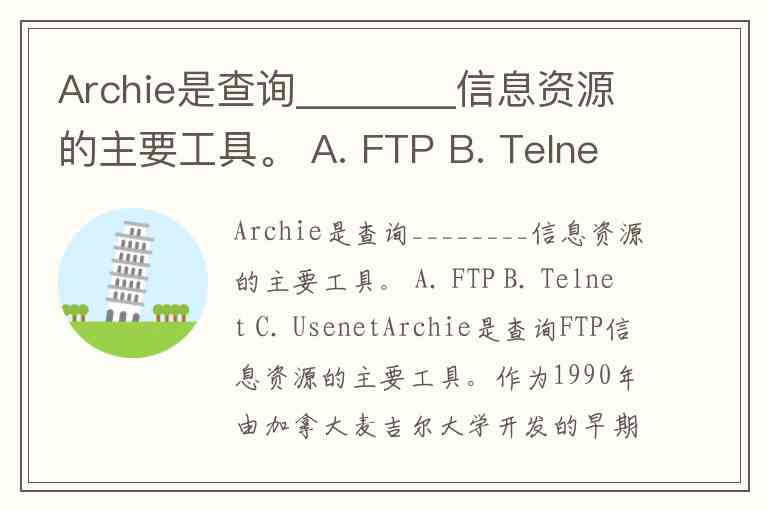 Archie是查询________信息资源的主要工具。 A. FTP B. Telnet C. Usenet