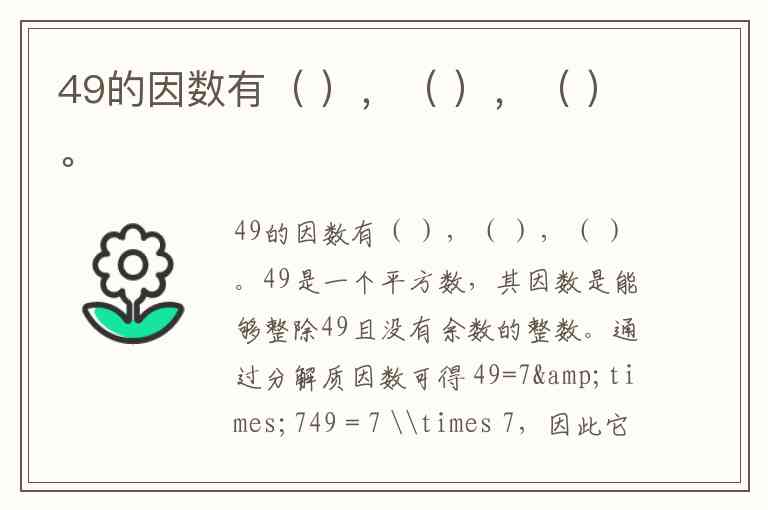49是一个平方数,其因数是能够整除49且没有余数的整数。通过分解质因数可得 49=7×7,因此它的因数包括1、7和49本身。