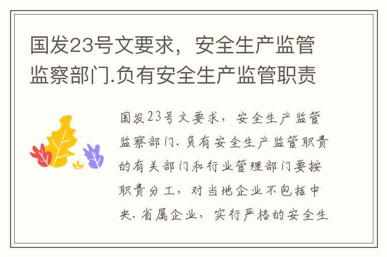 国发23号文要求,安全生产监管监察部门.负有安全生产监管职责的有关部门和行业管理部门要按职责分工,对当地企业不包括中央.省属企业,实行严格的安全生产监督检查和管理。( ) A. 正确 B. 错误
