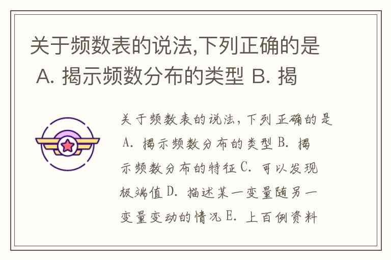 关于频数表的说法,下列正确的是 A. 揭示频数分布的类型 B. 揭示频数分布的特征 C. 可以发现极端值 D. 描述某一变量随另一变量变动的情况 E. 上百例资料,一般分8-15组