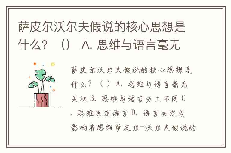 萨皮尔沃尔夫假说的核心思想是什么?() A. 思维与语言毫无关联 B. 思维与语言分工不同 C. 思维决定语言 D. 语言决定或影响着思维