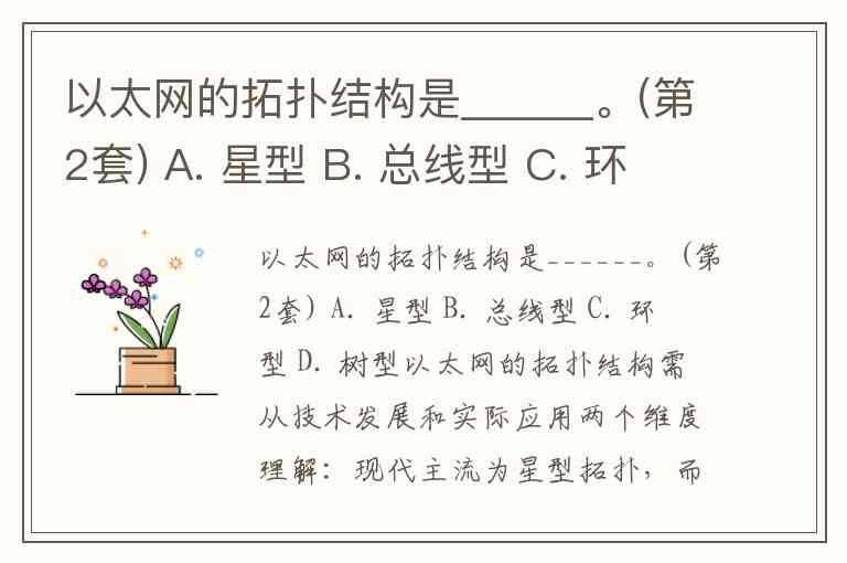 以太网的拓扑结构是______。(第2套) A. 星型 B. 总线型 C. 环型 D. 树型