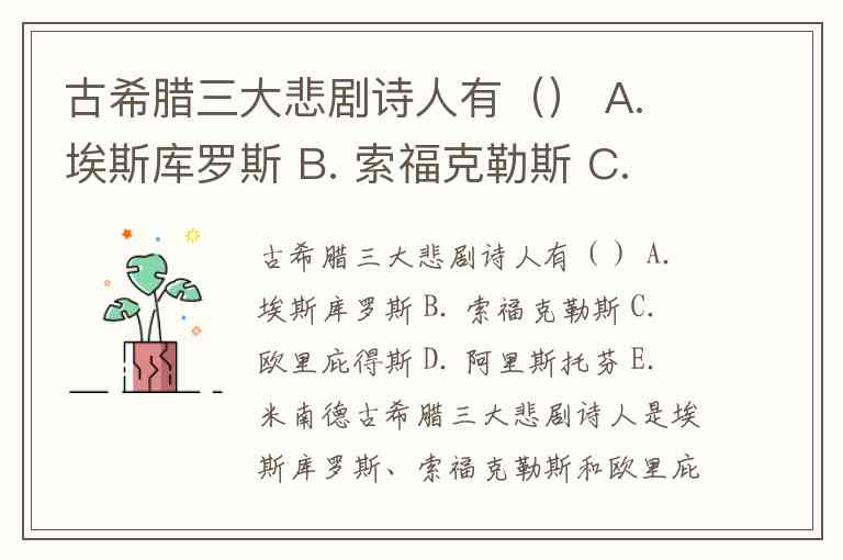 古希腊三大悲剧诗人有() A. 埃斯库罗斯 B. 索福克勒斯 C. 欧里庇得斯 D. 阿里斯托芬 E. 米南德