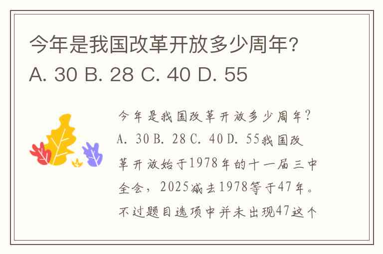 今年是我国改革开放多少周年? A. 30 B. 28 C. 40 D. 55