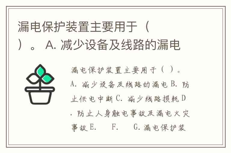 漏电保护装置主要用于( )。 A. 减少设备及线路的漏电 B. 防止供电中断 C. 减少线路损耗 D. 防止人身触电事故及漏电火灾事故 E. F. G.