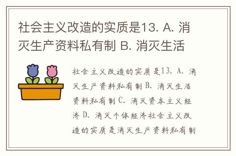 社会主义改造的实质是13. A. 消灭生产资料私有制 B. 消灭生活资料私有制 C. 消灭资本主义经济 D. 消灭个体经济