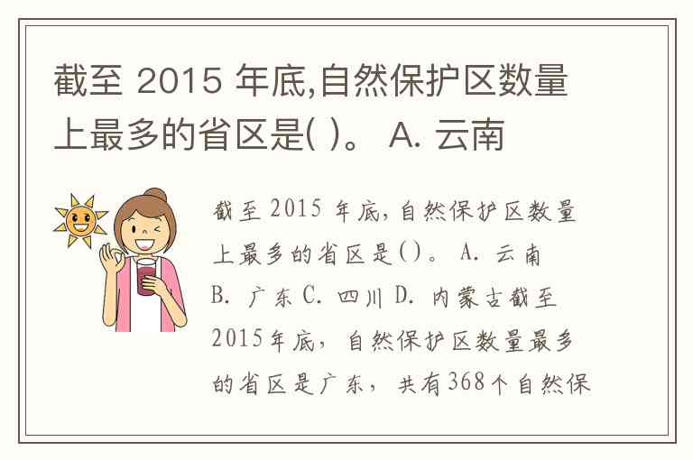 截至 2015 年底,自然保护区数量上最多的省区是( )。 A. 云南 B. 广东 C. 四川 D. 内蒙古
