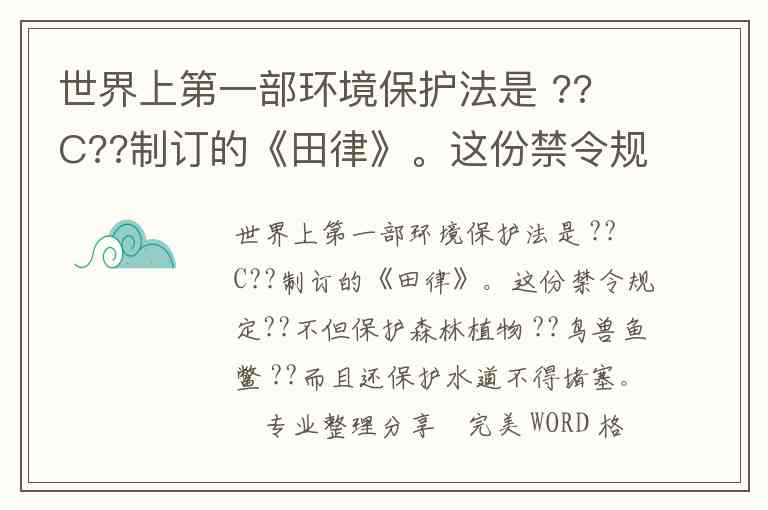 世界上第一部环境保护法是 ?? C??制订的《田律》。这份禁令规定??不但保护森林植物 ??鸟兽鱼鳖 ??而且还保护水道不得堵塞。⏺专业整理分享⏺完美 WORD 格式资料 A. ??唐朝 B. ??明朝 C. ??秦朝