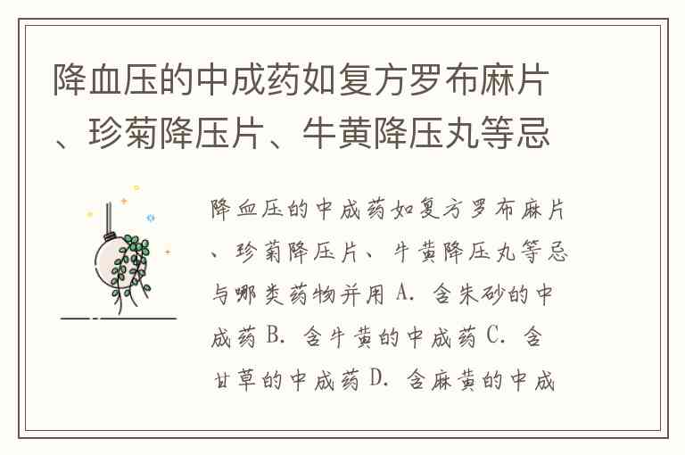 降血压的中成药如复方罗布麻片、珍菊降压片、牛黄降压丸等忌与哪类药物并用 A. 含朱砂的中成药 B. 含牛黄的中成药 C. 含甘草的中成药 D. 含麻黄的中成药 E. 含天麻的中成药