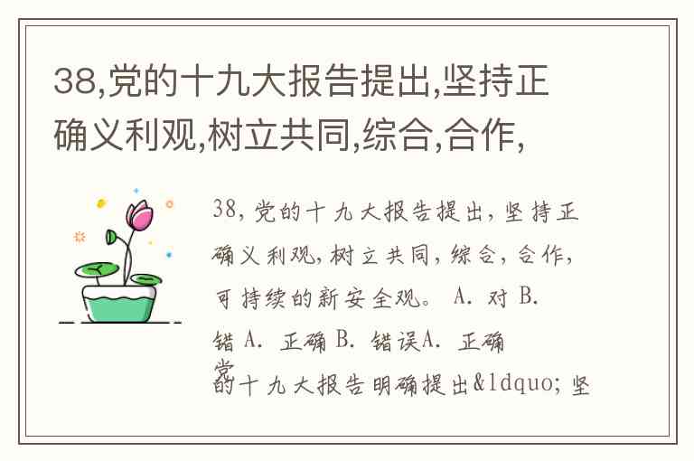 38,党的十九大报告提出,坚持正确义利观,树立共同,综合,合作,可持续的新安全观。 A. 对 B. 错 A. 正确 B. 错误